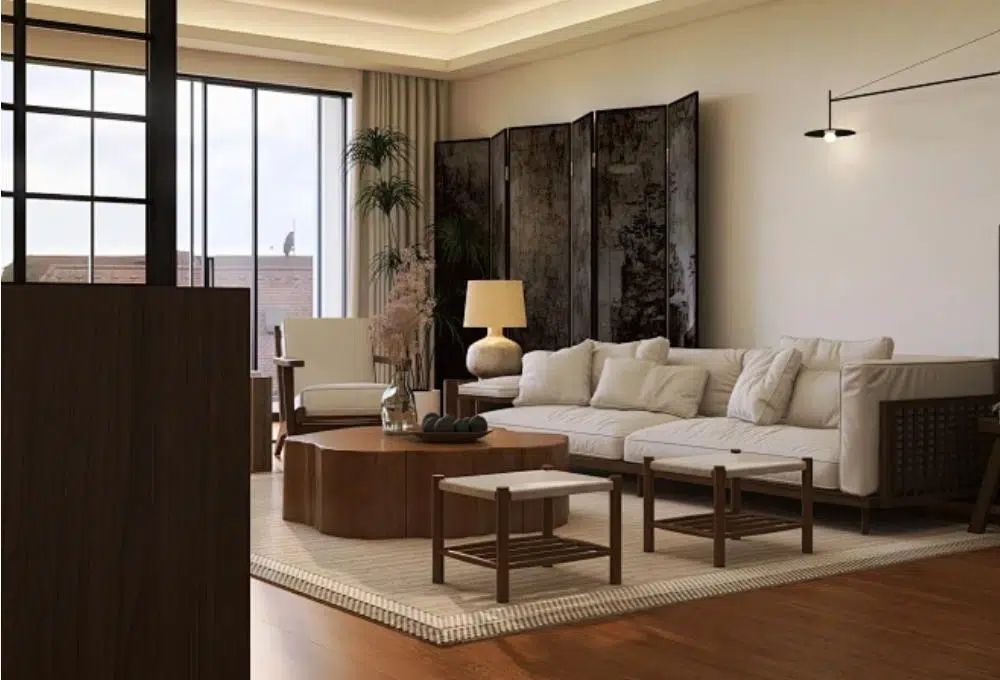 在客厅一隅,古朴的屏风以其精巧的镂空设计,在光影中投下斑驳的剪影。而脚下,三杉地板的沉稳色调,与屏风的深邃色彩形成巧妙的呼应。这种深浅相宜的对比,不仅提升了空间的视觉层次感,更赋予了空间一种沉淀下来的厚重感和文化气息。